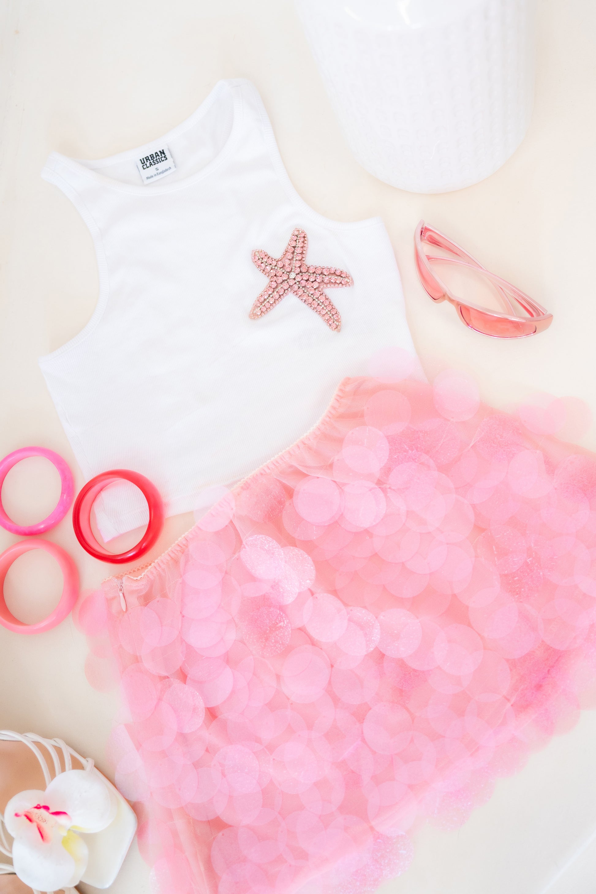 The ultimate island girl essential. The Paradiso Top is a cropped white ribbed vest featuring a sparkling pink diamanté starfish detail. Adding just the right amount of sparkle to your look.